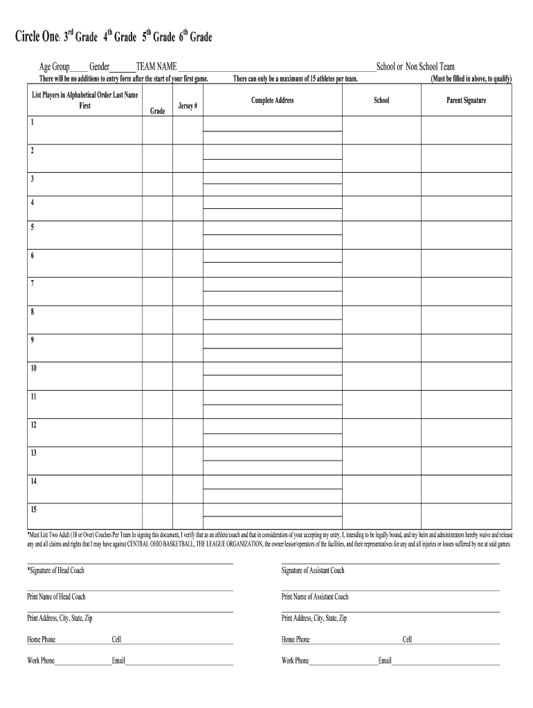 Circle One: 3rd Grade 4th Grade 5th Grade 6th Grade Age Group Gender TEAM NAME School or Non School Team There will be no additions to entry form after the start of your first game. List Players in