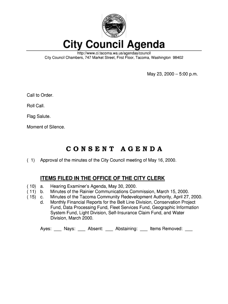 City Council Agenda http://www.ci.tacoma.wa.us/agendas/council City Council Chambers, 747 Market Street, First Floor, Tacoma, Washington 98402 May 23, 2000 5:00 p.m. Call to Order. Roll Call. Flag