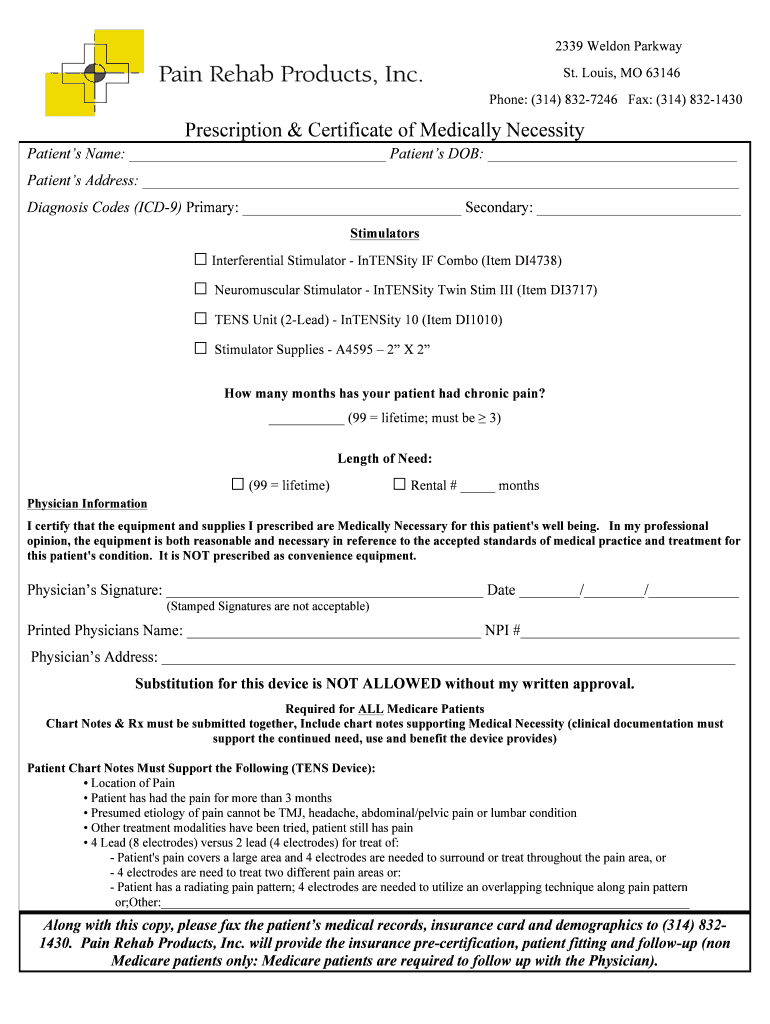 2339 Weldon Parkway St. Louis, MO 63146 Phone: (314) 8327246 Fax: (314) 8321430 Prescription & Certificate of Medically Necessity Patients Name: Patients DOB: Patients Address: Diagnosis Codes (ICD9)