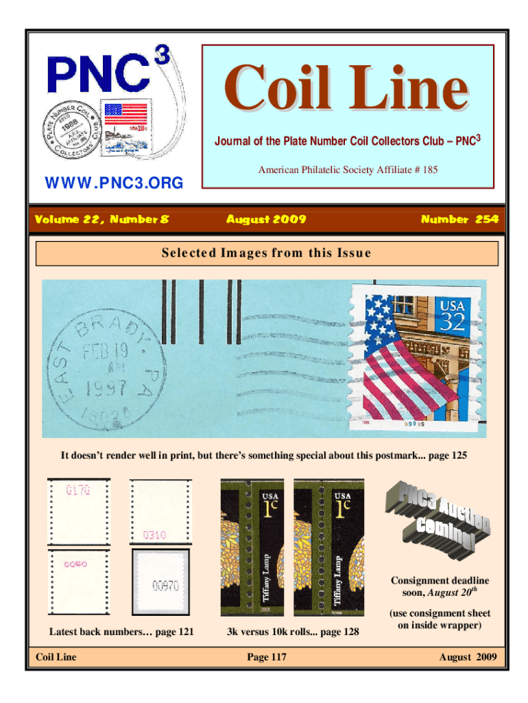 Coil Line Journal of the Plate Number Coil Collectors Club PNC3 American Philatelic Society Affiliate # 185W W.PNC3.ORG Volume 22, Number 8August 2009Number 254Selected Images from this Issue It doesn't