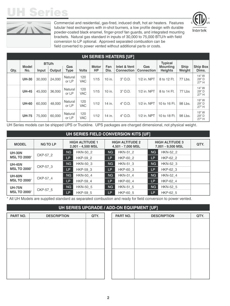 Packing List Replacement parts information is available online at www.detroitradiant.com/parts and in the product manual. TABLE OF CONTENTS UH Series Models & Add-On ...