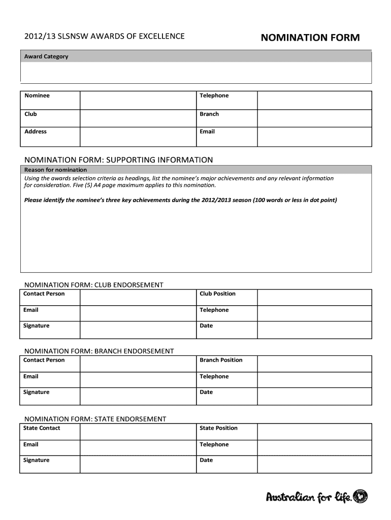Get the free NOMINATION FORM 2012/2013 SNB Awards Young Life Saver of ... - surflifesaving net