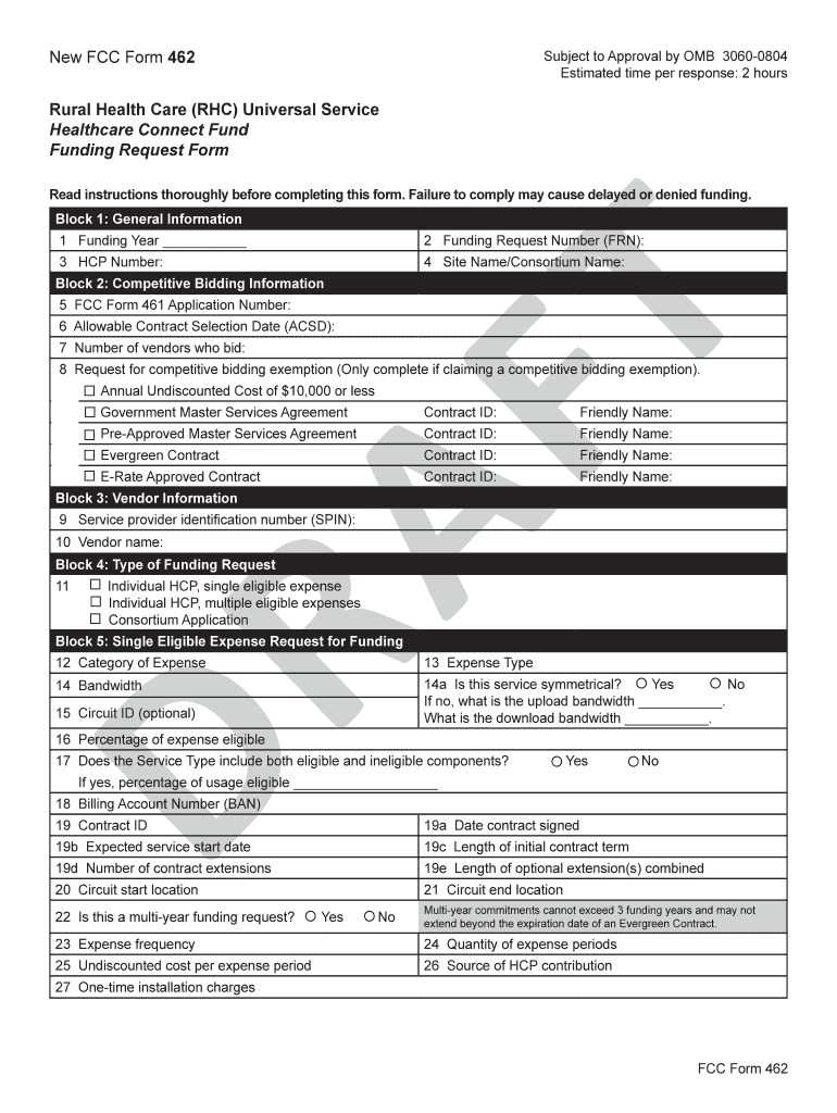 New FCC Form 462Subject to Approval by OMB 30600804 Estimated time per response: 2 hoursRural Health Care (RHC) Universal Service Healthcare Connect Fund Funding Request Form Read instructions thoroughly