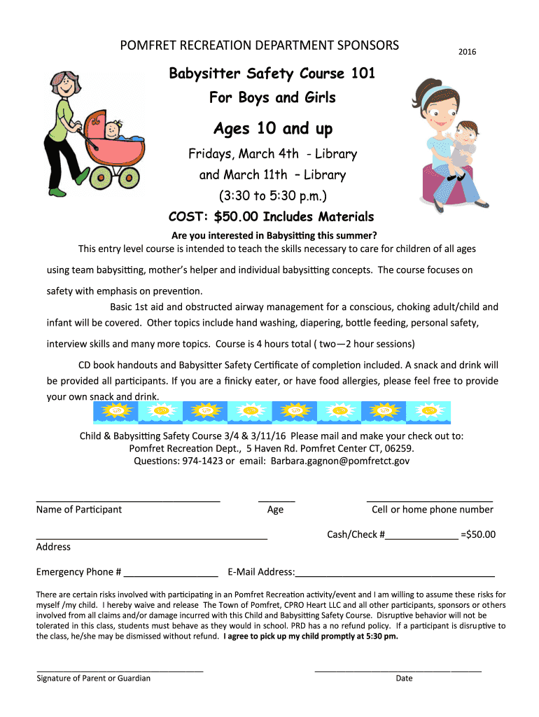 POIRET RECREATION DEPARTMENT SPONSORS 2016 Babysitter Safety Course 101 For Boys and Girls Ages 10 and up Fridays, March 4th Library and March 11th Library (3:30 to 5:30 p.m.) COST: $50.00 Includes