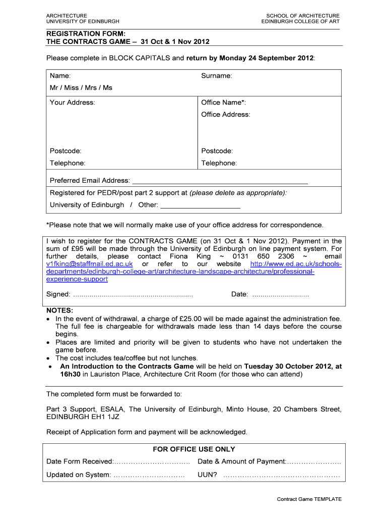 ARCHITECTURE UNIVERSITY OF EDINBURGH SCHOOL OF ARCHITECTURE EDINBURGH COLLEGE OF ART REGISTRATION FORM: THE CONTRACTS GAME 31 Oct & 1 Nov 2012 Please complete in BLOCK CAPITALS and return by Monday