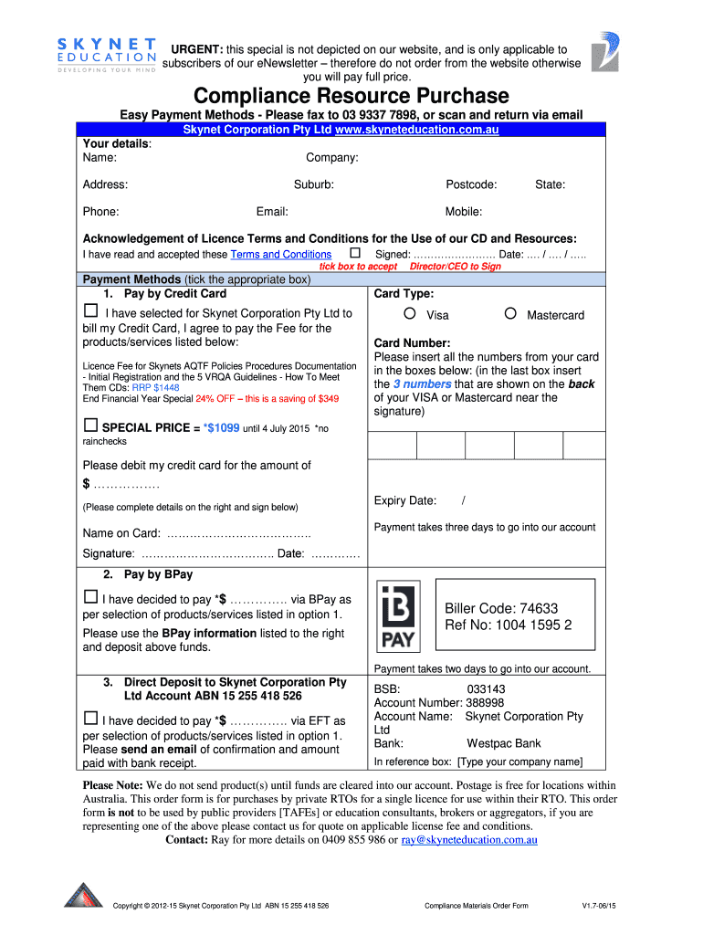 URGENT: this special is not depicted on our website, and is only applicable to subscribers of our newsletter therefore do not order from the website otherwise you will pay full price. Compliance Resource