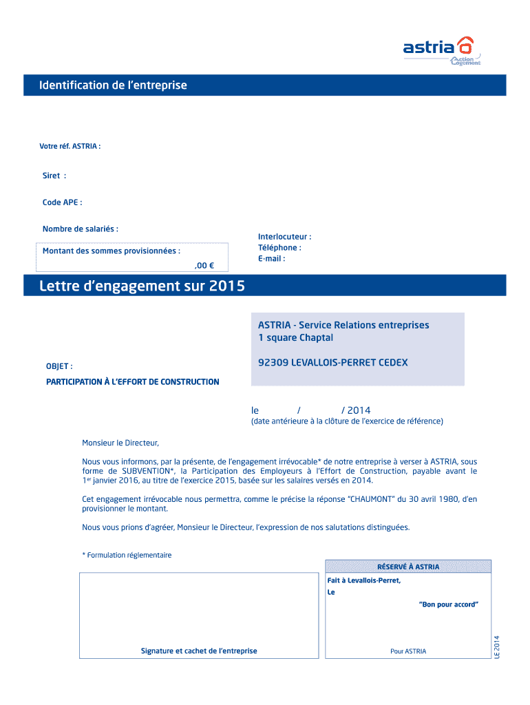Get the free Lettre dengagement sur 2015 - bASTRIAb Action Logement