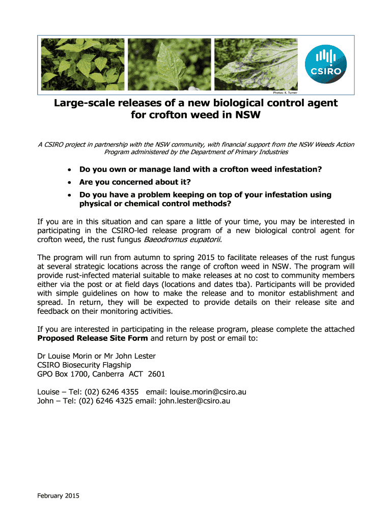 Photos: K. Turner Large scale releases of a new biological control agent for Crofton weed in NSW A CAIRO project in partnership with the NSW community, with financial support from the NSW Weeds Action