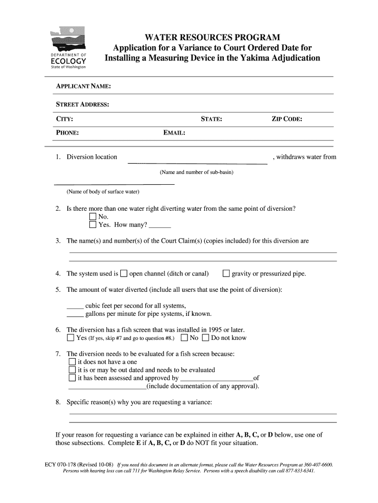 WATER RESOURCES PROGRAM Application for a Variance to Court Ordered Date for Installing a Measuring Device in the Yakima Adjudication APPLICANT NAME: STREET ADDRESS: CITY: STATE: PHONE: ZIP CODE: