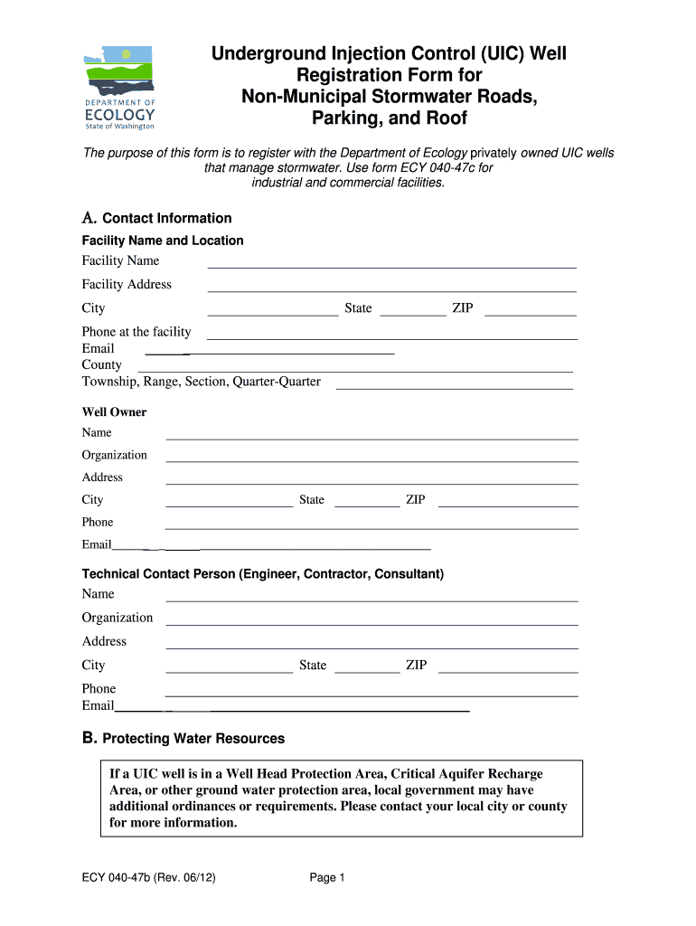 Underground Injection Control (UIC) Well Registration Form for Non-Municipal Stormwater Roads, Parking, and Roof The purpose of this form is to register with the Department of Ecology privately owned