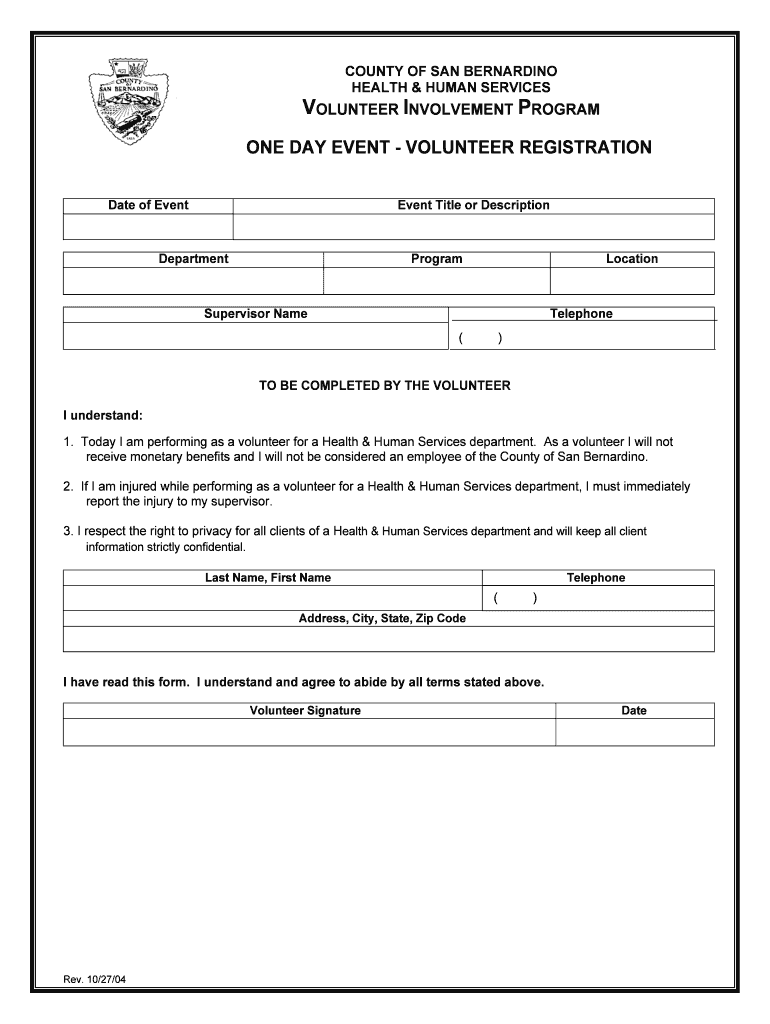 The Volunteer Registration Form is a document used by the County of San Bernardino to register individuals for one-day volunteer events.