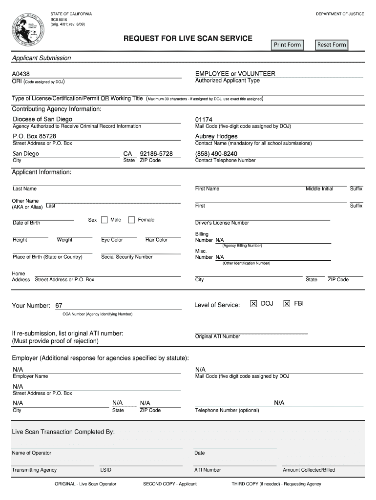 Get the free BCII 8016, Request for Live Scan Service Author: California Department of Justice, C...