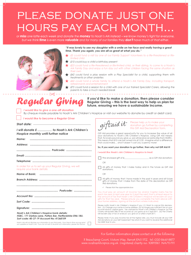 Get the free Please donate just one hours pay each month... - Noahs Ark ... - noahsarkhospice org