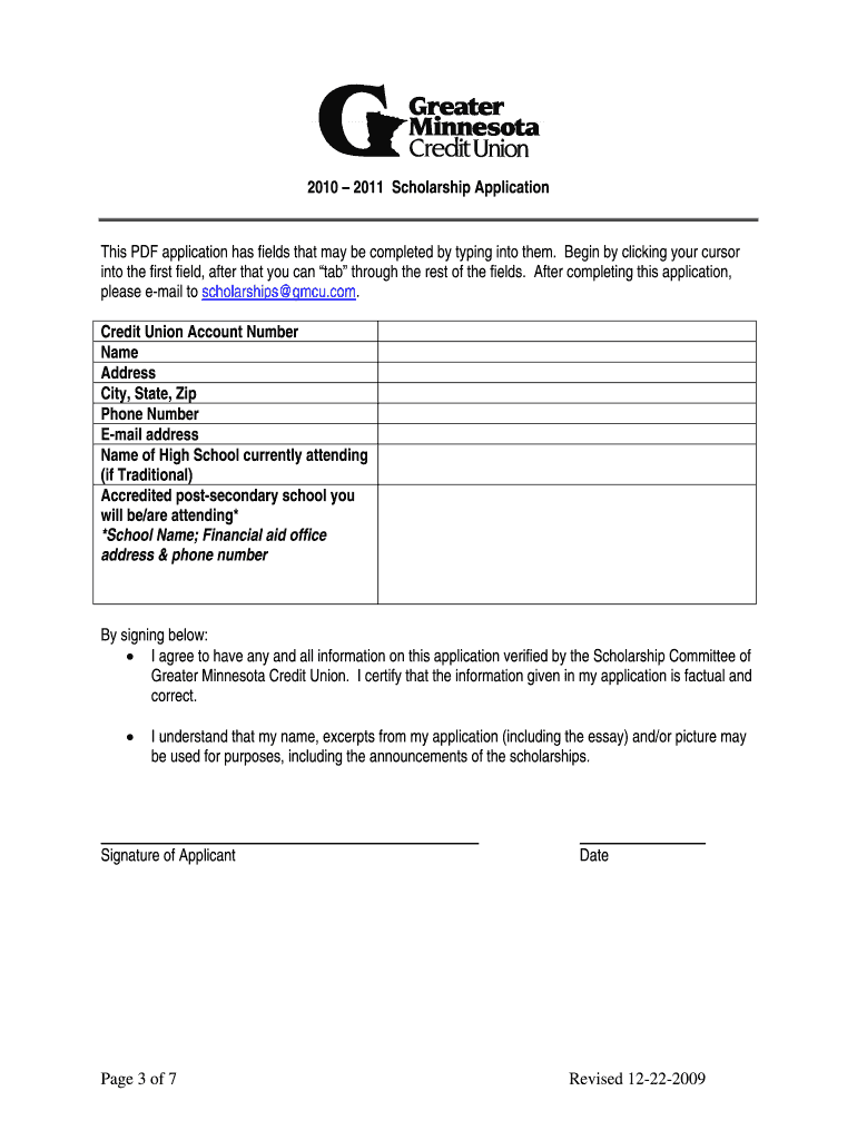 2010 2011 Scholarship Program As part of our commitment to higher education, Greater Minnesota Credit Union is offering a scholarship program to its membership. The program, which establishes Traditional