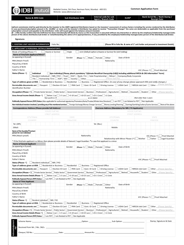 Common Application Form Mazatlan Center, 5th Floor, Norman Point, Mumbai 400 021 Website: www.idbimutual.co.in Name & ARN Code Internal code for sub Agent / branch Code Sub distributor ARN bank Serial