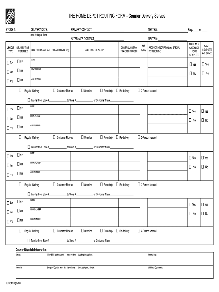THE HOME DEPOT ROUTING FORM Courier Delivery Service HDS3053 (12/03) STORE #: DELIVERY DATE: PRIMARY CONTACT: NEXT ...