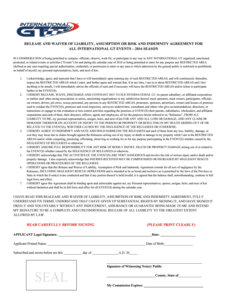 Release and waiver of liability, assumption or risk and indemnity agreement for all international gt events 2016 season in consideration of being permitted to ...
