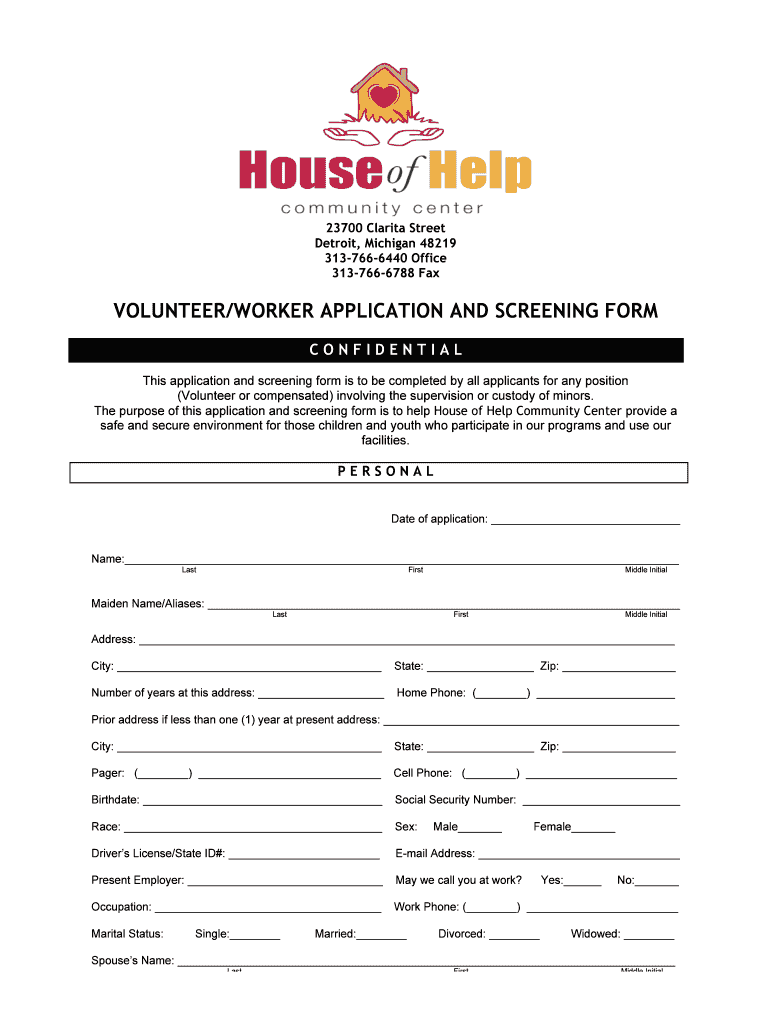 Get the free VOLUNTEERWORKER APPLICATION AND SCREENING FORM - houseofhelpcc