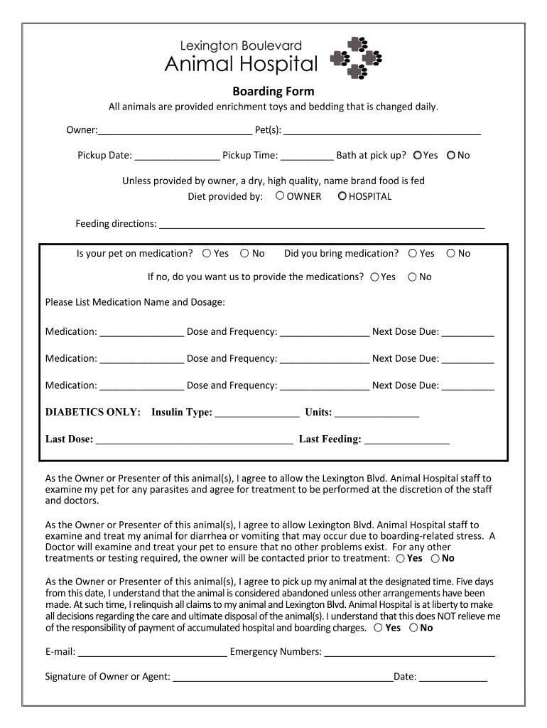 BoardingForm) Allanimalsareprovidedenrichmenttoysandbeddingthatischangeddaily. Owner: #Pet(s):# # PickupDate: Pickup×Time ...