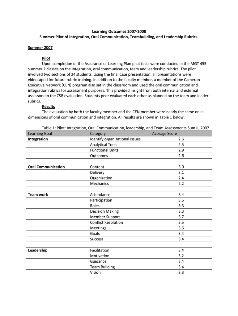 Get the free Learning Outcomes b2007b-2008 Summer Pilot of Integration Oral bb - csb uncw