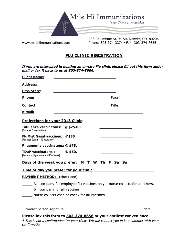 283 Columbine St. ×150, Denver, CO 80206 Phone: 3033743374 Fax: 3033748656 www.milehiimmunizations.com FLU CLINIC REGISTRATION If you are interested in hosting an onsite Flu clinic please fill out