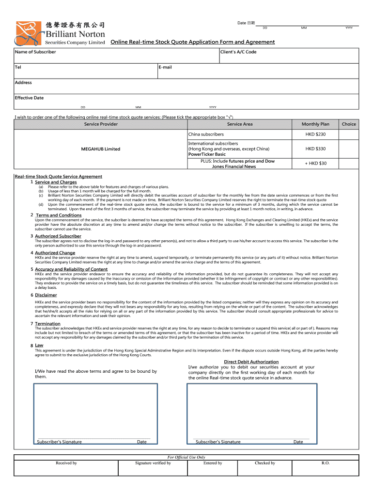 Date DD MM YYY Online Real-time Stock Quote Application Form and Agreement Name of Subscriber Client's A/C Code Tel Email Address Effective Date DD MM YYY I wish to order one of the following online