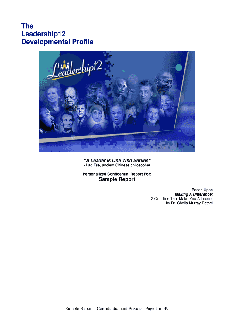The Leadership12 Developmental Profile “A Leader Is One Who Serves Lao TSE, ancient Chinese philosopher Personalized Confidential Report For: Sample Report Based Upon Making A Difference: 12 Qualities