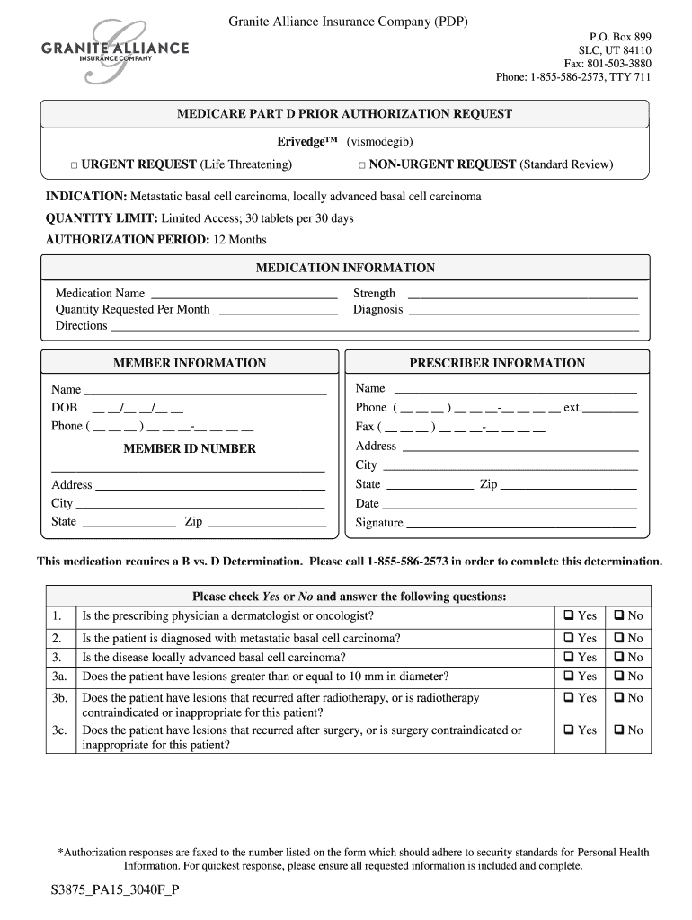 Granite Alliance Insurance Company (PDP) P.O. Box 899 SLC, UT 84110 Fax: 8015033880 Phone: 18555862573, TTY 711 MEDICARE PART D PRIOR AUTHORIZATION REQUEST Bridge (vismodegib) URGENT REQUEST (Life