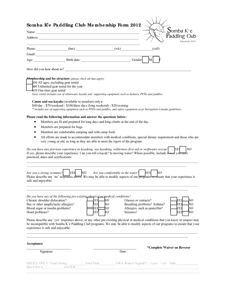 Get the free Somba K e Paddling Club Membership Form 2012 Name: Address - sombakepaddling