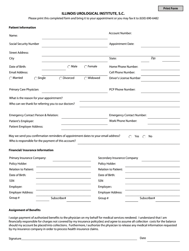 ILLINOIS UROLOGICAL INSTITUTE, S.C. Please print this completed form and bring it to your appointment, or you may fax it to (630) 690-6482 Name: Appointment Date: