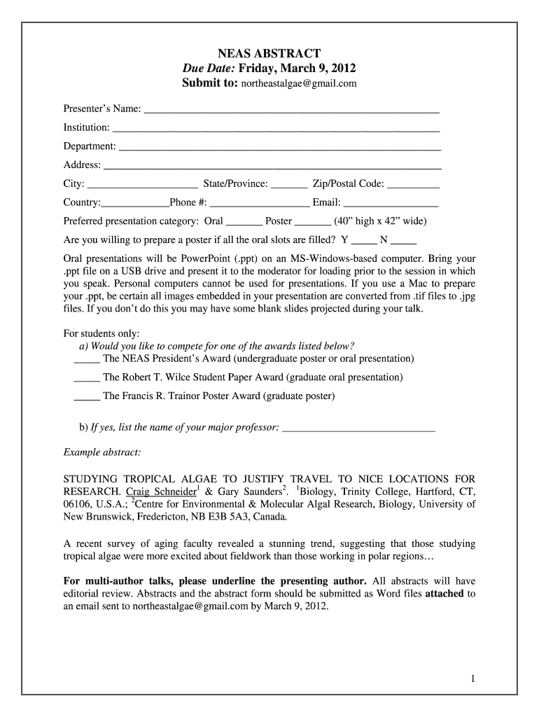 Get the free NEAS ABSTRACT Due Date: Friday, March 9, 2012 Submit to: northeastalgae gmail - e-neas