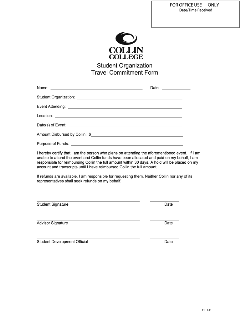 FOR OFFICE USE ONLY Date/Time Received Student Organization Travel Commitment Form Name: Date: Student Organization: Event Attending: Location: Date(s) of Event: Amount Disbursed by Collin: $ Purpose