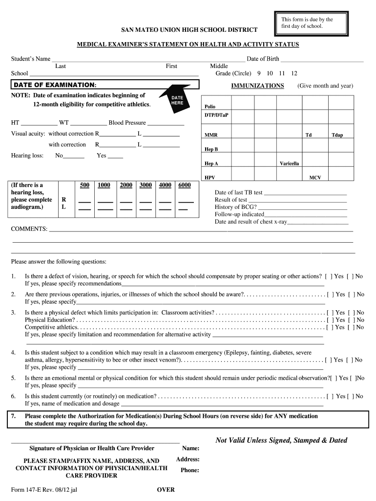 SAN MATEO UNION HIGH SCHOOL DISTRICT This form is due by the first day of school. MEDICAL EXAMINERS STATEMENT ON HEALTH AND ACTIVITY STATUS Students Name Date of Birth Last First Middle School Grade