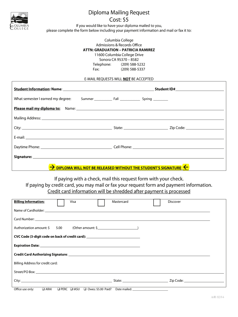Clear Form Diploma Mailing Request Cost: $5 If you would like to have your diploma mailed to you, please complete the form below including your payment information and mail or fax it to: Columbia