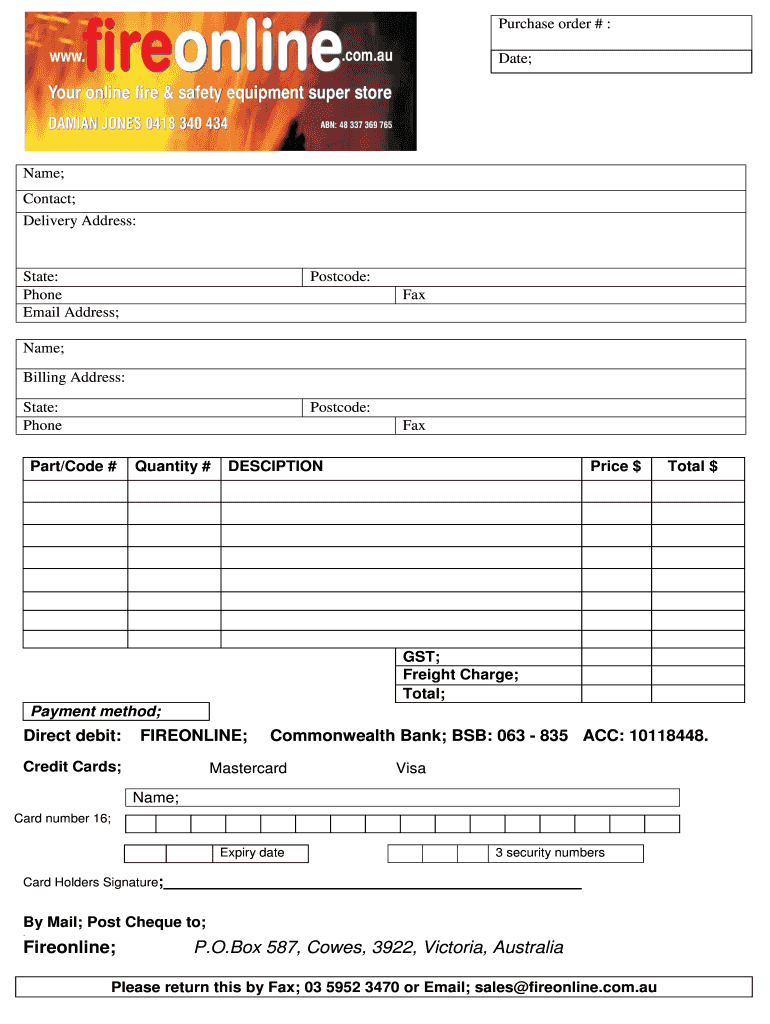 Purchase order # : Date; Name; Contact; Delivery Address: State: Phone Email Address; Postcode: Fax Name; Billing Address: State: Phone Postcode: Fax Part/Code # Quantity # DESCRIPTION Price $ Total