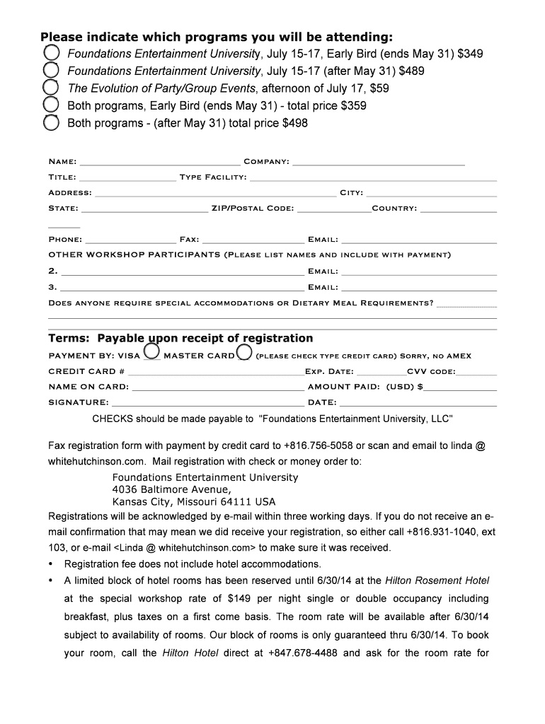 Please indicate which programs you will be attending:! Foundations Entertainment University, July 15-17, Early Bird (ends May 31) $349 ! Foundations Entertainment ...