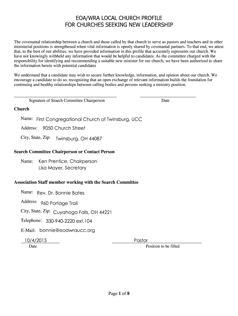 Get the free EOAWRA LOCAL CHURCH PROFILE FOR CHURCHES SEEKING NEW