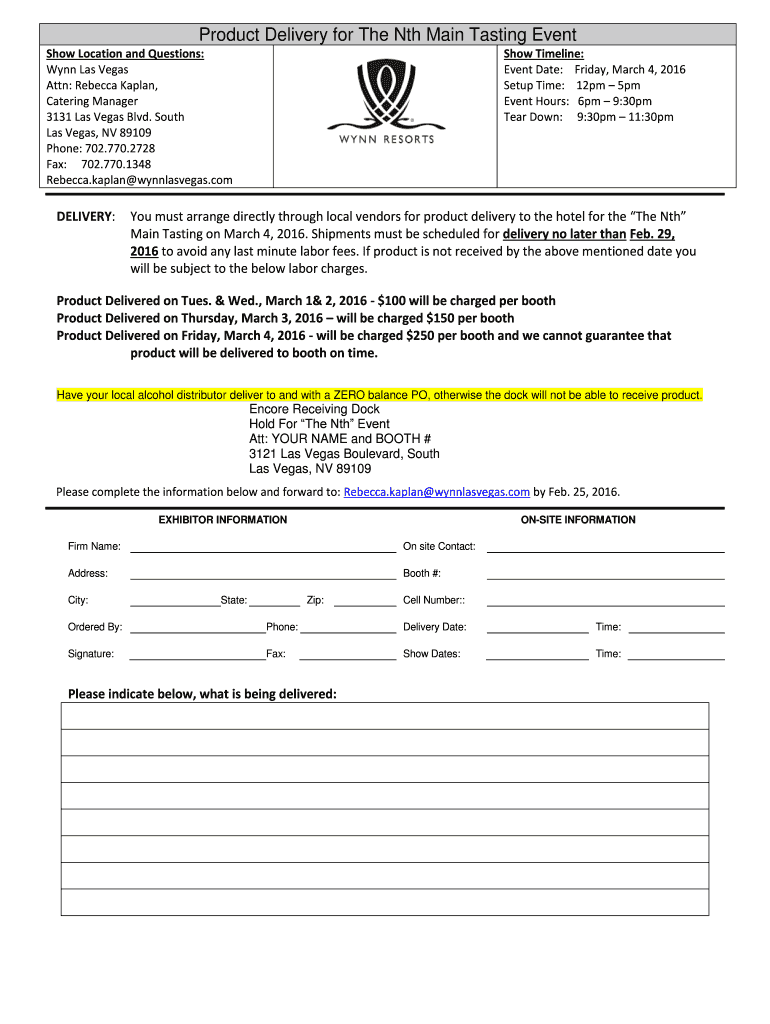 Product Delivery for The Nth Main Tasting Event Show Location and Questions: Wynn Las Vegas Attn: Rebecca Kaplan, Catering Manager 3131 Las Vegas Blvd. South Las Vegas, NV 89109 Phone: 702.770.2728