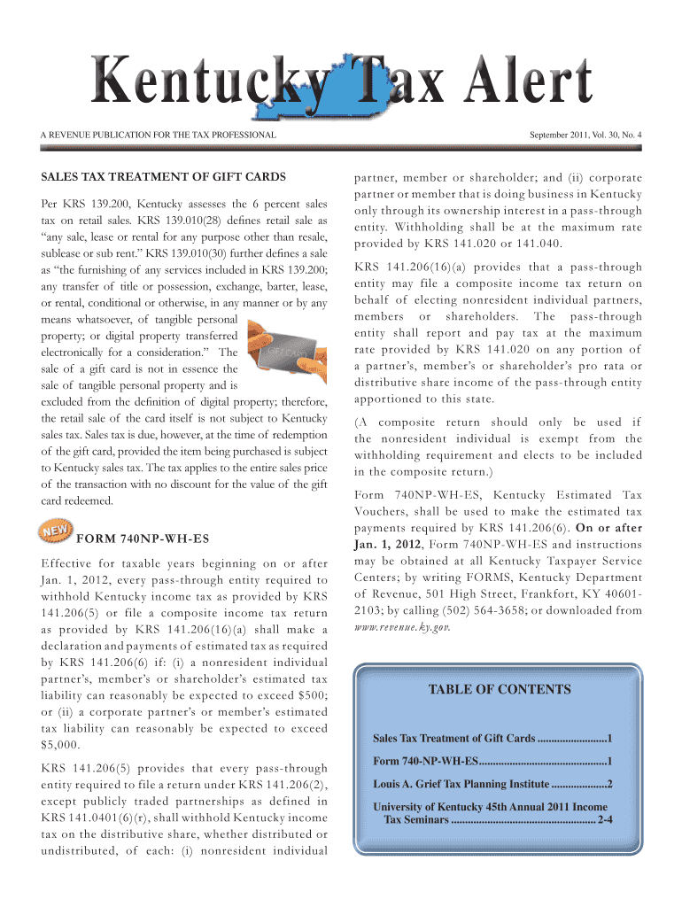 A REVENUE PUBLICATION FOR THE TAX PROFESSIONAL SALES TAX TREATMENT OF GIFT CARDS Per MRS 139.200, Kentucky assesses the 6 percent sales tax on retail sales. MRS 139.010(28) dens retail sale as any