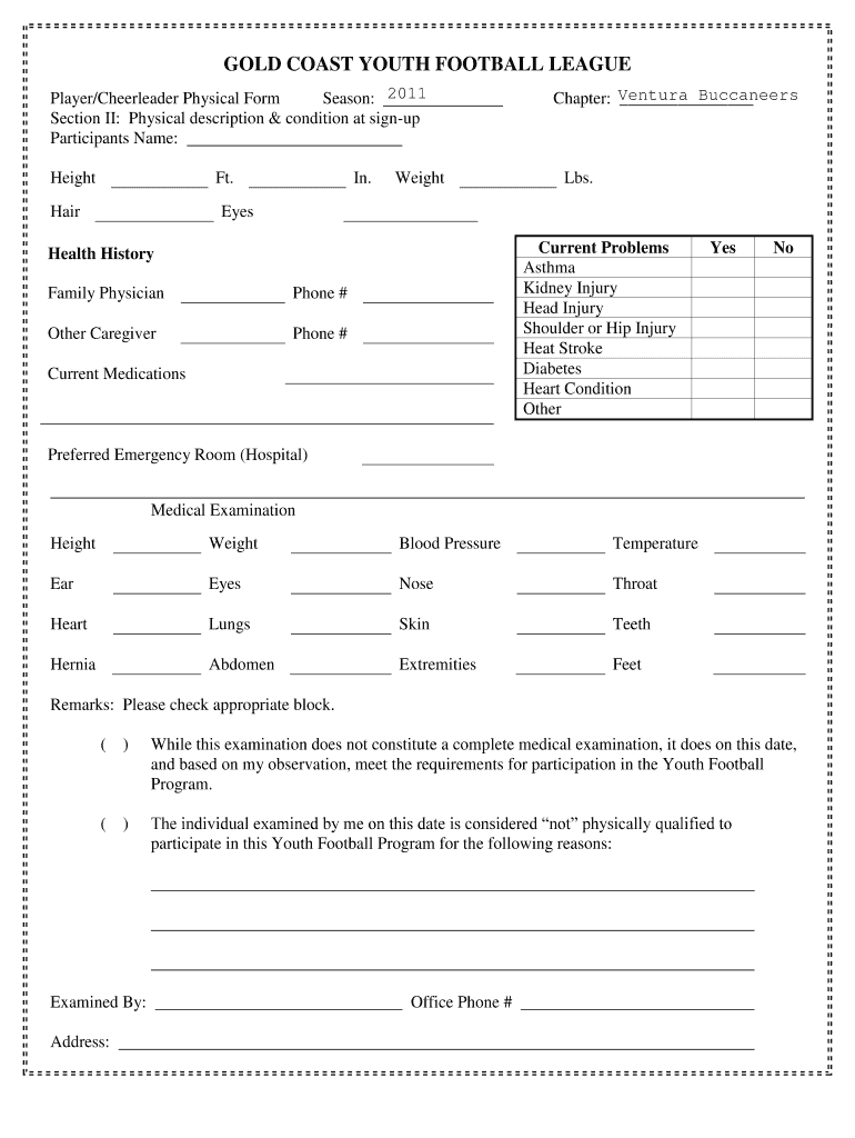 GOLD COAST YOUTH FOOTBALL LEAGUE. Player/Cheerleader Physical Form Season: Chapter: Section II: Physical description & condition at sign-up.