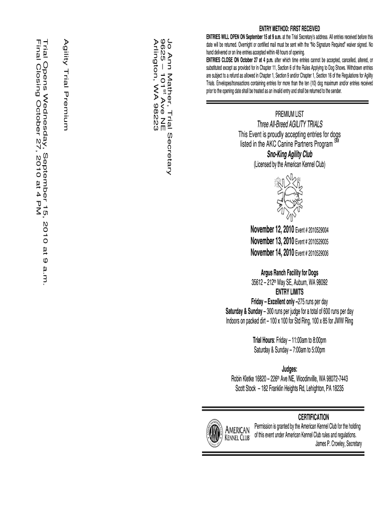 ENTRY METHOD: FIRST RECEIVED Jo Ann Mather, Trial Secretary 9625 101st Ave NE Arlington, WA 98223 Agility Trial Premium Trial Opens Wednesday, September 15, 2010, at 9 a.m. Final Closing October 27,