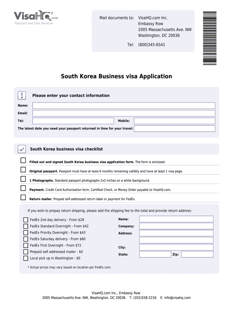 NW, Washington, DC 20036 T: (202)558-2216 E: info visahq.com. South ... Filled out and signed South Korea business visa application form. The form is ...
