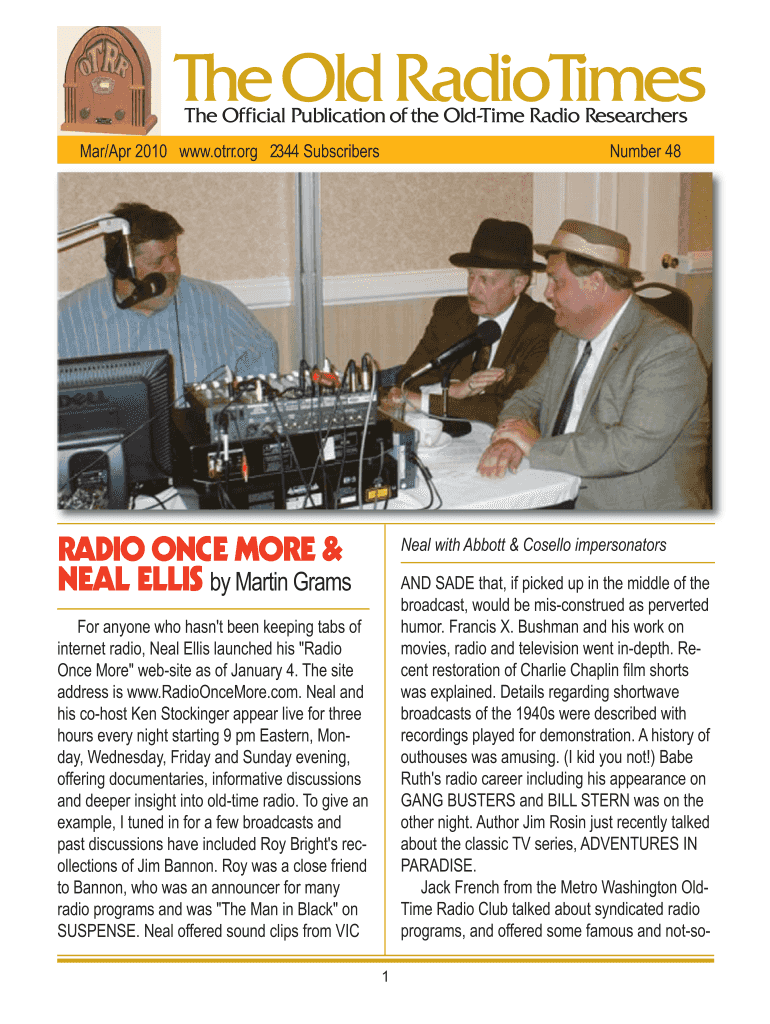 The Old Rarities The Official Publication of the Old-Time Radio Researchers Mar/Apr 2010 www.otrr.org 2344 Subscribers Number 48 RADIO ONCE MORE & NEAL ELLIS by Martin Grams Neal with Abbott & Costello