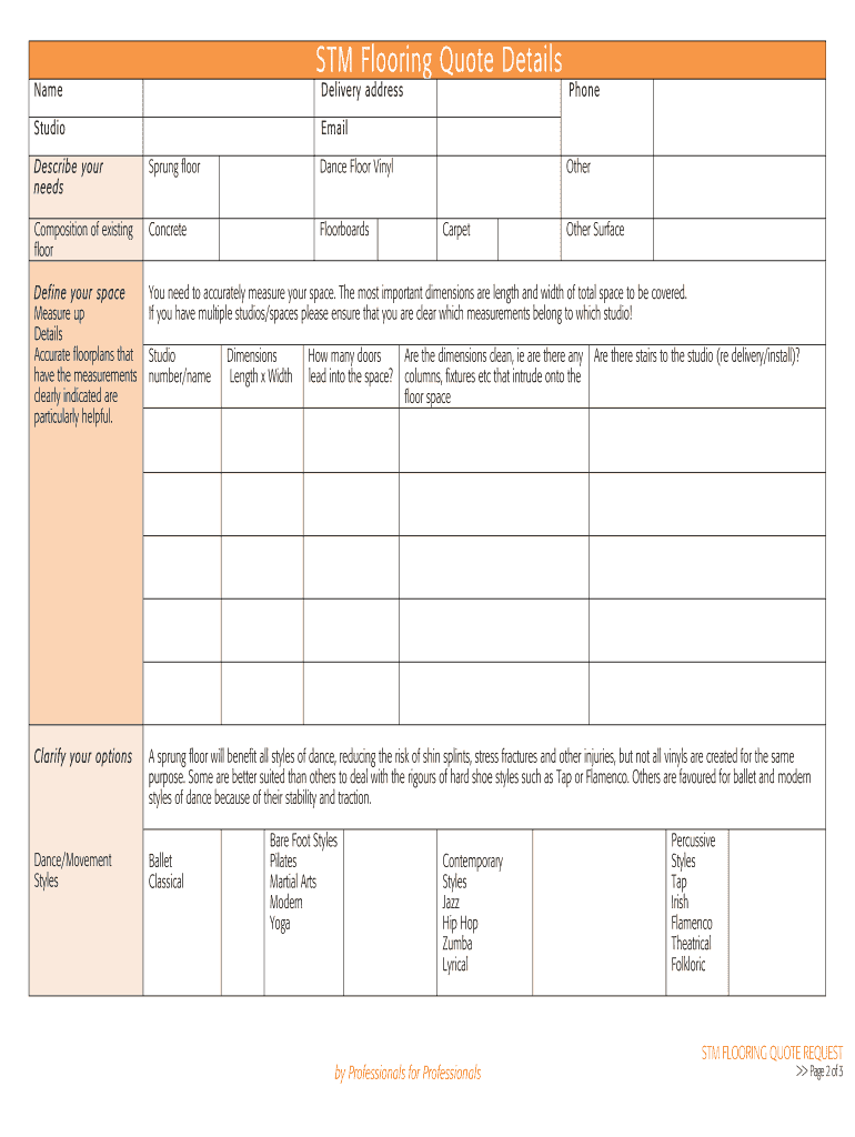 By Professionals for Professionals! STM FLOORING QUOTE REQUEST Page 2of 3 STM Flooring Quote Details Name Delivery address Phone Studio Email.