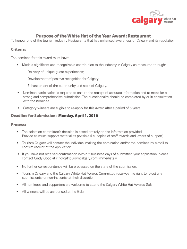 Purpose of the White Hat of the Year Award: Restaurant To honor one of the tourism industry Restaurants that has enhanced awareness of Calgary and its reputation. Criteria: The nominee for this award