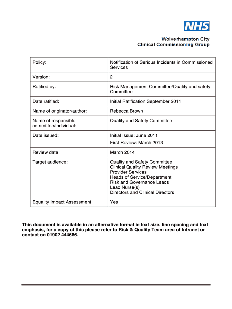 ServicesVersion:2Ratified by:Risk Management Committee/Quality and safety