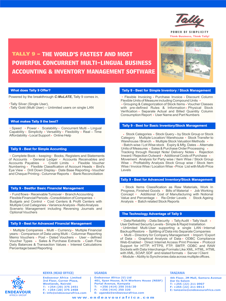 Think Business, Think Tally!TALLY 9 THE WORLDS FASTEST AND MOST POWERFUL CONCURRENT MULTILINGUAL BUSINESS ACCOUNTING & INVENTORY MANAGEMENT SOFTWAREWhat does Tally 9 Offer? Tally 9 Best for Simple