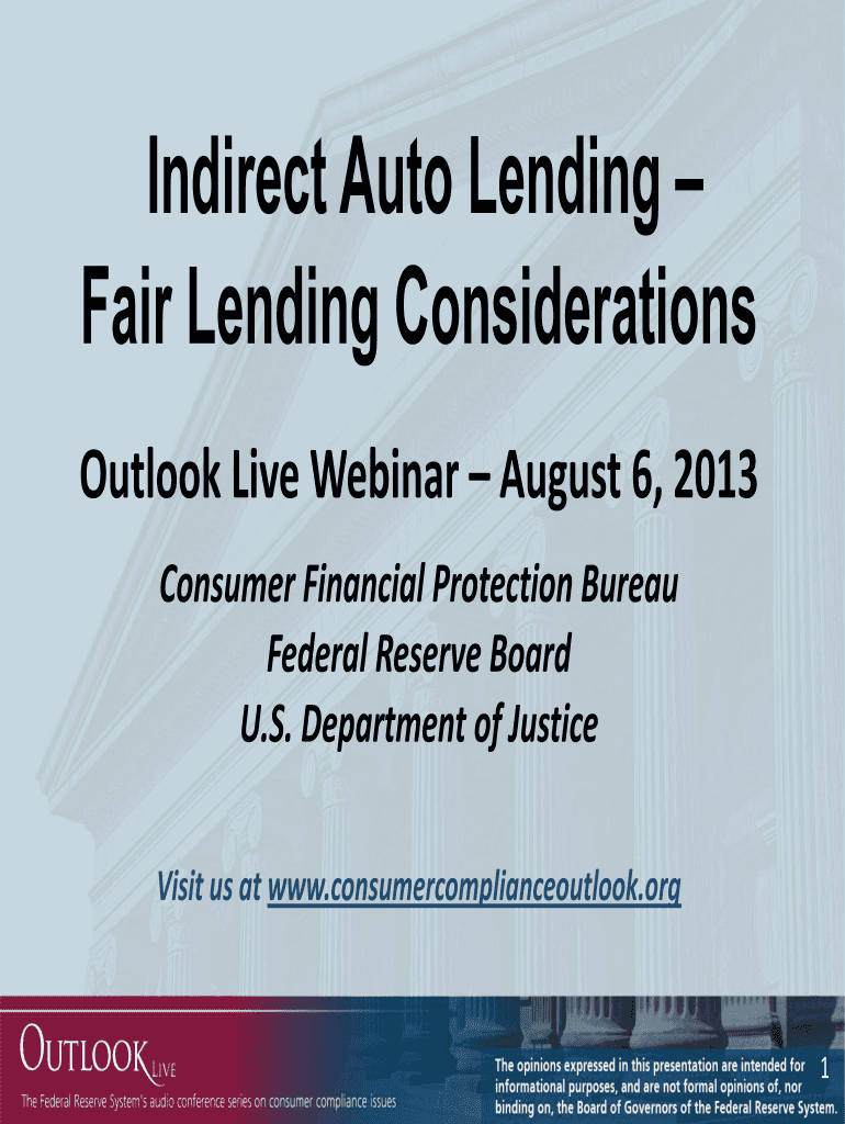 Indirect Auto Lending Fair Lending Considerations Outlook Live Webinar August 6, 2013, Consumer Financial Protection Bureau Federal Reserve Board U.S. Department of Justice Visit us at www.consumercomplianceoutlook.org1Overview