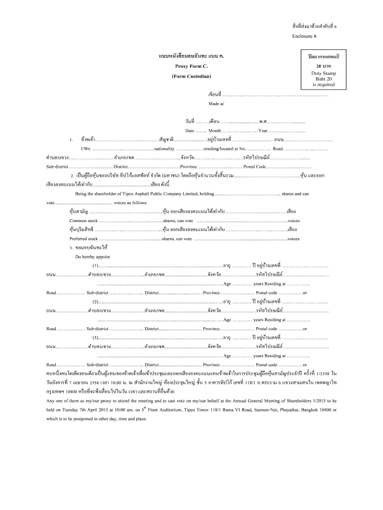 6 Enclosure 6. Proxy Form C. (Form Custodian) 20 Duty Stamp Baht 20 is required ... Made at. . ....................................... Date