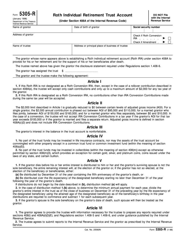 Get the free Form 5305-R Rev January 1998 Roth Individual Retirement Trust Account - irs